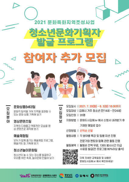 김해문화재단 문화도시센터는 ‘청소년 문화기획자 발굴 프로그램’ 참여자를 추가 모집한다. 대상은 문화기획에 관심 있는 만 14~24세 김해시 거주 청소년 20명이며, 모집 기간은 이달 20일부터 8월 3일까지다.