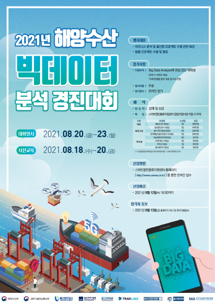 해양수산 빅데이터에 관심 있는 3학년 이상의 대학생이라면 지역제한 없이 8월 12일까지 누구나 참가 신청이 가능하며, 팀당 4명으로 구성된 총 10팀을 선발해 4일간 비대면으로 진행된다.