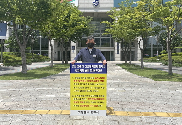 부산 기장군은 오규석 군수가 22일 정오 무렵 부산시청 앞을 찾아 ‘장안읍 명례리 일대 산업폐기물 매립장 사업계획’에 대한 반대 1인 시위를 13번째 진행했다고 밝혔다.
