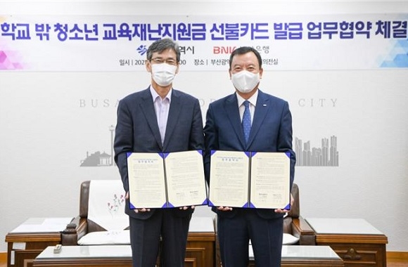 한편 이에 앞서 어제(22일) 오후 부산시는 BNK부산은행과 ‘학교 밖 청소년 교육재난지원금 선불카드 발급을 위한 협약’을 체결했다. 이에 부산은행은 재난지원금 선불카드의 무료 발급과 운영시스템 구축 등을 수행하기로 했다.