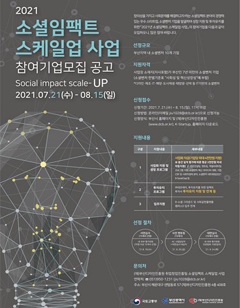 부산시가 소셜임팩트 분야의 우수 스타트업과 소셜벤처 기업을 발굴하고 성장을 지원하기 위해 ‘2021 소셜임팩트 스케일업 사업’에 참여할 기업을 내달 15일까지 모집한다고 23일 공고했다.