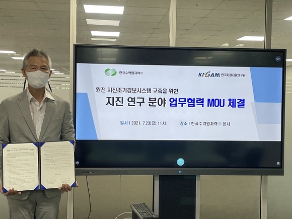 한국수력원자력(한수원)이 23일 원전의 지진대응 역량 강화를 위해 한국지질자원연구원(KIGAM)과 '원전 지진조기경보시스템 기술협력' MOU를 체결했다.
