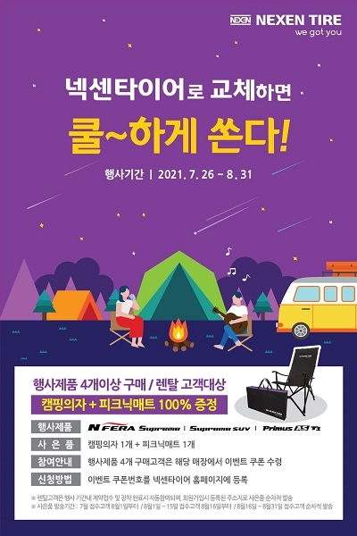 넥센타이어는 오는 8월 31일까지 행사 제품 4개를 구매 및 렌탈하는 고객에게 '캠핑 의자와 피크닉 매트'로 교환 할 수 있는 쿠폰을 증정한다. 사회적 거리두기로 최근 수요가 증가하고 있는 캠핑 및 차박과 관련한 트렌드를 반영했다. 쿠폰 번호를 넥센타이어 홈페이지 내 이벤트 페이지에 입력하면 주소지로 사은품이 배송된다.