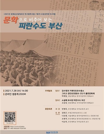 부산연구원이 오는 28일 오후 2시 화상 프로그램 ‘ZOOM’으로 ‘세계유산 등재추진 연구 협력사업 3차 포럼, 문학으로 비춰보는 피란수도 부산’을 개최한다고 26일 밝혔다.