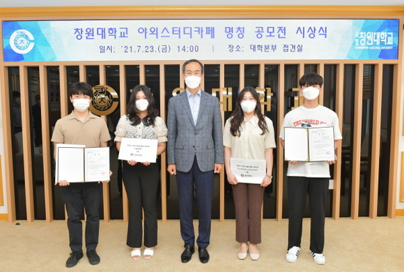창원대학교 대학본부에서 열린 야외 스터디 카페 명칭 공모전 시상식에서 이호영 총장(가운데)과 학생들이 기념촬영을 하고 있다. (사진=창원대 제공)