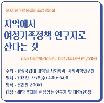 ‘지역에서 여성가족정책 연구자로 산다는 것’ 온라인 강연 안내. (사진=경상국립대 제공)