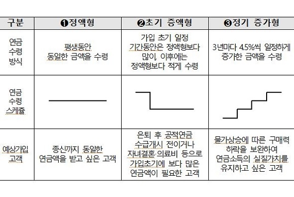 이번 상품은 ▲‘초기 증액형’(정액형은 유지하되 초기에 더 많이 받는 기간을 3~10년까지 선택) ▲‘정기 증가형’(매년 물가 상승에 따른 구매력 하락 보완을 위해 정기적으로 연금액 상승) 2가지로 나눠 출시한다.