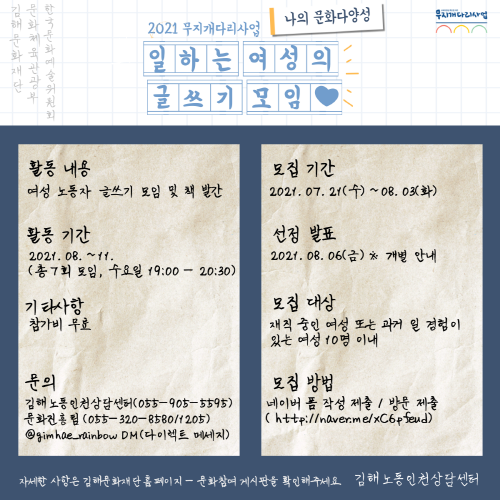 김해문화재단은 2021 무지개다리사업 일환으로 진행하는 ‘나의 문화다양성 사업’의 ‘여성 노동자 글쓰기 모임’ 참여자를 오는 8월 3일까지 모집한다.