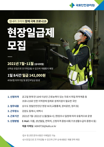 근무지는 정밀안전진단이 진행 중인 강원도 태백시와 동해시 일대이며, 진단이 종료되는 11월까지 상시 모집한다. 하루 8시간 근무이며 4대보험 가입과 함께 14만 2000원의 일당이 지급된다.