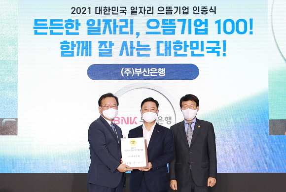 BNK부산은행이 지난 27일 고용노동부(고용부)가 주관하는 ‘대한민국 일자리 으뜸기업 인증식’에서 ‘으뜸기업 100’에 선정되는 영광을 안았다고 28일 밝혔다.