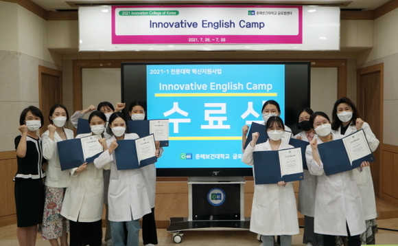 ‘Innovative English Camp’ 수료식에 참여한 간호학과 학생들이 기념촬영을 하고 있다. (사진=춘해보건대 제공)