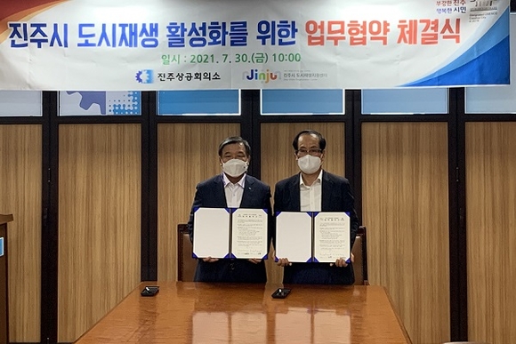 진주시 도시재생지원센터는 지난 30일 진주상공회의소와 도시재생 뉴딜사업의 성공적인 추진을 위해 협력 네트워크를 구축하는 업무협약을 체결했다.