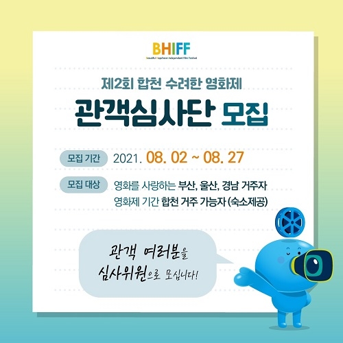관객심사단 모집기간은 오는 8월 2일부터 27일까지며, 제2회 합천 수려한영화제는 오는 10월 21일부터 25일까지 총 5일간, 합천영상테마파크를 중심으로 열린다.