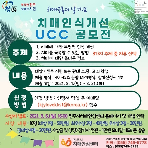 경남 진주시는 9월 21일 치매극복의 날을 기념해 치매 친화적인 사회 문화 조성과 치매 인식 개선을 위해 '치매인식개선 UCC 공모전'을 연다고 2일 밝혔다.