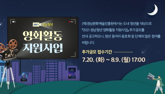 모집 대상은 경남에서 1년 이상 거주 중인 만 19세 이상 34세 이하의 회원으로 구성된 단체다. 지원 분야는 영화 시나리오, 제작, 비평, 연구, 기획사업 등이며, 최소 100만원에서 최대 400만원까지 지원한다. 선정된 단체는 사업의 안정적인 진행과 내실을 위해 관련 전문가로부터 멘토링을 받을 수 있다.