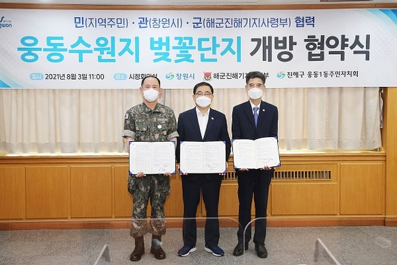 경남 창원시는 3일 진해 동부권 내 시민들이 즐길 수 있는 공원 조성을 위한 일환으로 웅동수원지 벚꽃단지 개방을 위한 민·관·군 협약식을 가졌다.
