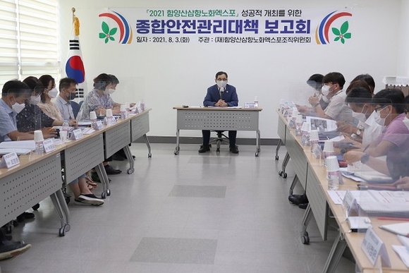 함양산삼항노화엑스포조직위원회는 3일 조직위원회 회의실에서 안전한 엑스포 개최를 위한 종합안전관리대책 보고회를 가졌다.