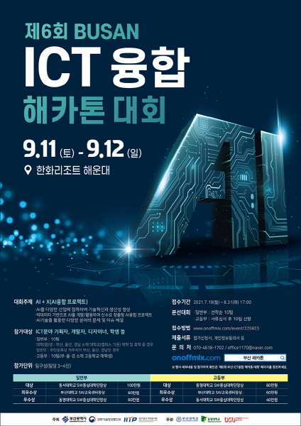 이어 ‘제6회 부산ICT융합 해카톤 대회’가 9월 11일부터 12일까지 부산 한화리조트 해운대에서 이틀간 열린다. 예비창업자·학생 등 동남권 지역의 SW 인재가 AI+X(AI융합 프로젝트)라는 주제로 다양한 영역에서 인공지능 기술과 다른 분야의 기술을 융합해 새로운 아이디어를 창출한다. 8월 31일까지 참가 신청을 할 수 있다.