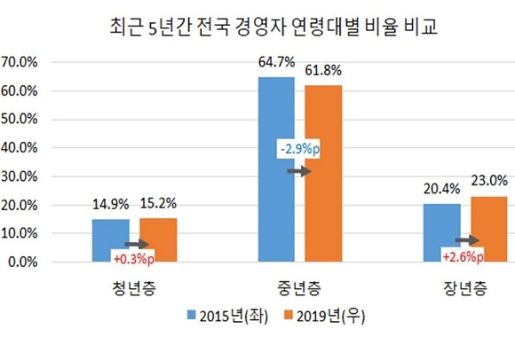 이에 반해 40세 미만 청년층 경영자와 40~60세 미만 중년층 경영자의 비중은 각각 14.1%, 58.5%로 위 비교 도시들 가운데 가장 낮은 것으로 집계됐다.