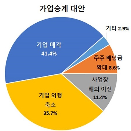 이외에도 가업승계 시 애로사항에 대한 질문에 ‘승계를 위해 부담해야 할 상속세, 증여세 부담’을 꼽은 기업이 58.2%로 가장 많았다. 또 가업승계가 여의치 않을 경우 대안으로 ‘가업을 매각하겠다’는 응답이 41.4%로 가장 많았으며 이어 ‘기업 외형 축소’ 의견이 35.7%, ‘해외로 사업장을 이전할 것’ 응답이 11.4%에 달해 가업 상속 공제제도를 보완하는 등 대책 마련이 필요해 보인다.