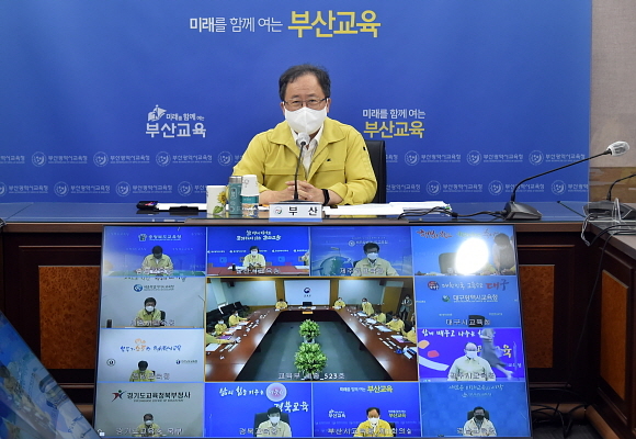 지난 4일 오전 10시 ‘전국 시·도 교육감 화상 간담회’가 열린 가운데 김석준 부산시교육감이 시교육청 제1회의실에서 화상 회의에 참석하고 있다. 이날 유은혜 부총리 겸 교육부 장관도 참석한 가운데 전국 시·도 교육감과 함께 2학기 학사 운영과 방역 강화 방안에 대해 논의했다. (사진=부산시교육청 제공)