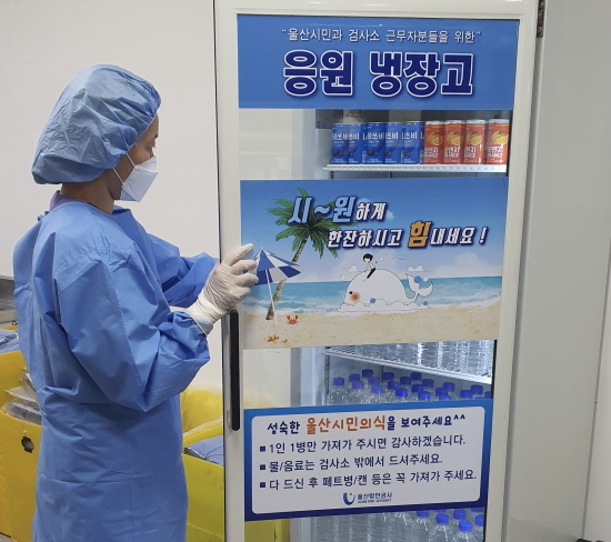 울산항만공사(이하 UPA)가 연일 계속되는 폭염 속에서도 코로나19 방역에 힘쓰고 있는 선별진료소 의료진과 검사를 위해 방문한 시민을 위해 ‘응원 냉장고’를 설치·운영한다고 밝혔다.