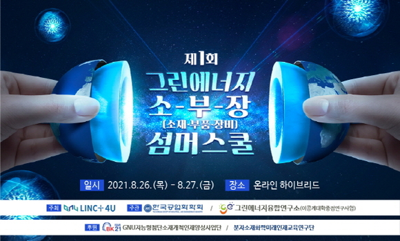 경상국립대학교(GNU) 사회맞춤형 산학협력선도대학(LINC+) 육성사업단이 주최하고 한국공업화학회와 그린에너지융합연구소(이공계대학중점연구사업)가 주관하는 ‘제1회 그린에너지 소재·부품·장비 서머스쿨’이 오는 26일과 27일 비대면으로 진행된다.