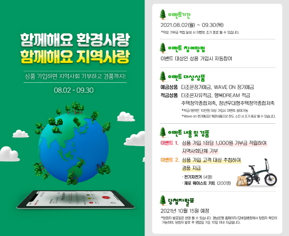 한편, 함‘께해요 환경사랑 함께해요 지역사랑 ESG 이벤트’에 참여할 수 있는 금융상품 중 하나인 Wave On 정기예금은 한도 5000억원 규모로 판매하고 있다.