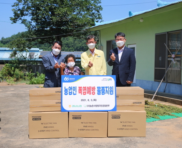 경남농협은 5일 전국적인 열돔현상으로 최악의 폭염이 지속하는 가운데 사천시 정동면을 방문해 취약계층 농업인을 대상으로 ‘안전 여름나기 선풍기’를 전달했다.