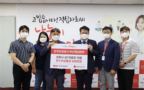 한국도로공사 부산경남본부는 지역 내 코로나19 확산 방지 및 대응을 위해 헌신하고 있는 의료진을 지원하기 위한 온누리상품권 500만원을 대한적십자사 경남지사에 전달했다고 6일 밝혔다.
