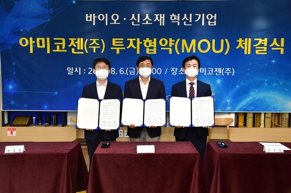 협약에 따르면 아미코젠은 진주시 문산읍 생명산업전문농공단지 내 총 6398㎡의 부지에 의약용 미생물 단백질 cGMP 제조시설 건립에 약 380억 원을 투자하게 된다.