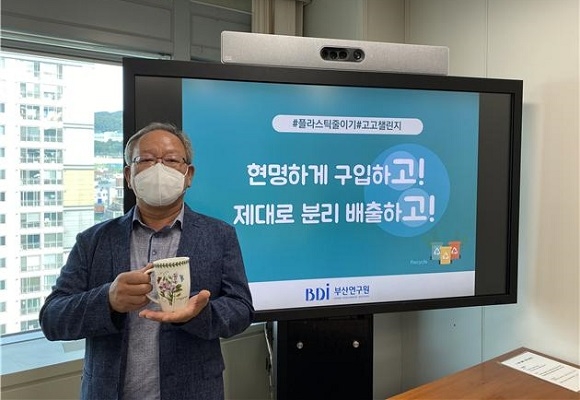 송교욱 부산연구원장이 9일 생활 속 플라스틱 줄이기 홍보 캠페인인 ‘고고 챌린지’에 참여한 가운데 개인 컵을 들고 인증샷을 찍고 있다.