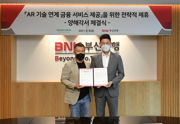BNK부산은행이 지난 6일 오후 본점에서 미디어 콘텐츠 기술 전문기업인 코코아비전과 ‘증강현실(AR) 기술 연계 금융서비스 도입’ 협약을 체결했다고 9일 밝혔다.