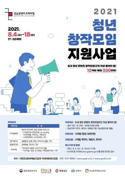경남문화예술진흥원은 오는 18일까지 ‘2021 경남콘텐츠코리아랩 청년 창작모임 지원사업’ 참가팀을 모집한다고 9일 밝혔다.
