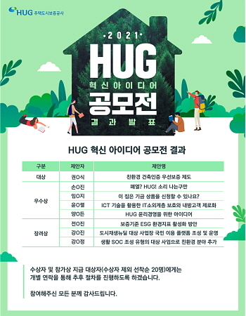 ‘대국민 혁신 아이디어 공모전’은 지난 2017년부터 시행됐으며 HUG는 선정된 우수 아이디어를 공사 혁신과제로 추진한 바 있다. 올해 선정된 아이디어도 검토 후 혁신과제로 추진하게 된다.