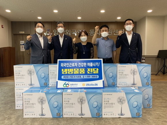 경남농협은 10일 양산외국인노동자지원센터에서 농업분야 외국인근로자를 위한 폭염극복 냉방물품 전달과 함께 외국인근로자 지원 관련 현장의견을 청취했다.