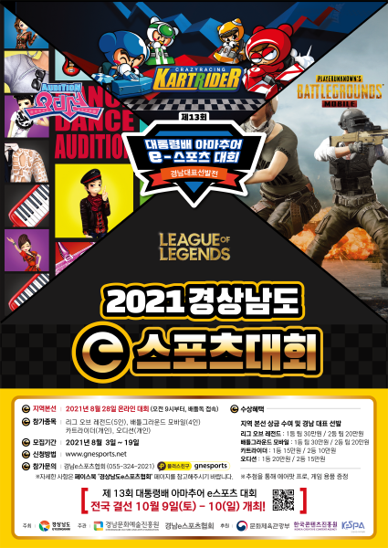 오는 19일까지 경남e스포츠협회 누리집을 통해 대회 참가자를 모집하며 28일 배틀독 접속을 통해 온라인으로 KeG 경남대표 선수를 선발할 예정이다. 참가 종목은 ▲리그 오브 레전드 ▲배틀그라운드 모바일 ▲카트라이더 ▲오디션 4개 종목이다.