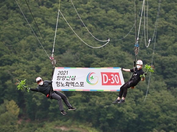 2021함양산삼항노화엑스포 D-30일을 앞둔 11일 경남 함양군 병곡면 대봉산휴양밸리에서 안전요원들이 짚라인을 타며 퍼포먼스를 진행하고 있다. 엑스포는 상림공원 을 제1행사장, 대봉산휴양밸리는 제2행사장으로 '천년의 산삼, 생명연장의 꿈'이라는 주제로 다음달 10일부터 10월 10일까지 열린다. (사진=함양군 제공)