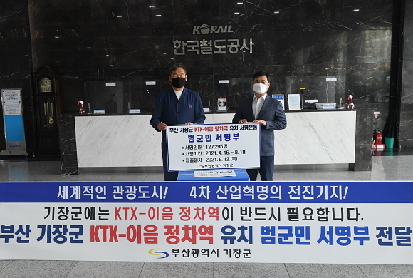 앞서 기장군은 지난 4월 15일부터 KTX 이음 정차역 유치를 위해 ‘범군민 서명운동’을 벌여 지난 10일까지 총 12만 7295명의 서명을 받았다.