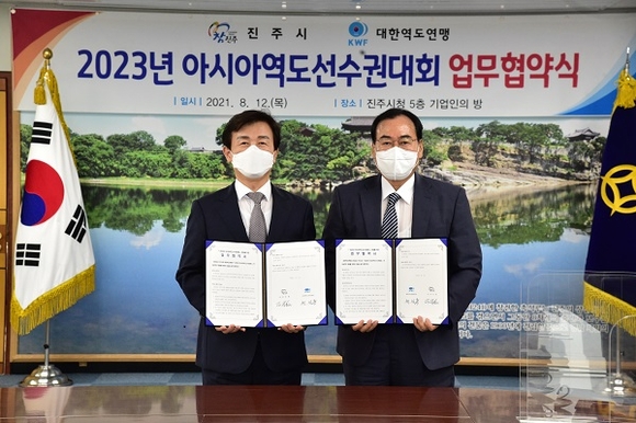진주시는 12일 오후 시청 기업인의 방에서 '2023년 아시아역도선수권대회'의 성공적인 유치 및 개최를 골자로 하는 진주시와 대한역도연맹의 업무협약식을 가졌다.