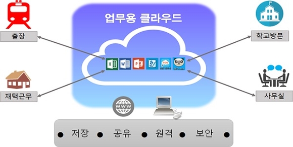 사용자는 집과 출장지 등 사무실 이외의 장소에서 노트북이나 PC 등에 업무용클라우드 프로그램을 설치하고 실행하면 사무실 PC 환경과 동일한 상황에서 업무를 수행할 수 있다.