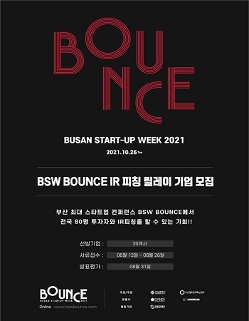 부산시가 ‘부산 스타트업 위크 바운스(BSW 바운스) 2021’ 행사의 릴레이 기업설명회(IR)에 참여할 스타트업을 오는 26일 오후 5시까지 모집한다고 19일 공고했다.