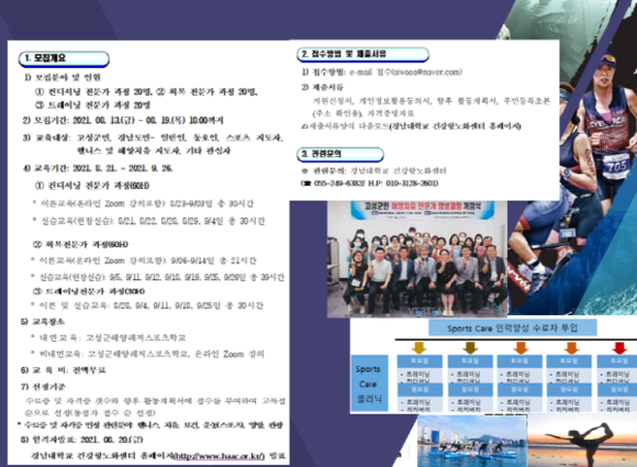 경남대학교 건강항노화센터는 지난 13일부터 고성군민 및 경남도민을 대상으로 ‘고성군 아이언맨 스포츠케어 전문가 양성과정’의 교육생을 모집하고 있다.