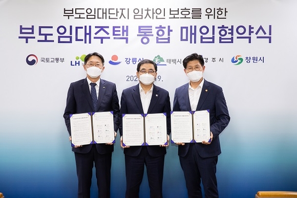 경남 창원시는 19일 정부세종청사에서 노형욱 국토교통부장관, 김현준 한국토지주택공사(LH) 사장과 함께 창원시 조양하이빌 부도임대주택 매입 사업의 협약식을 가졌다.