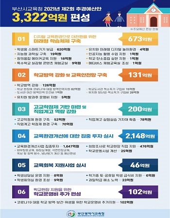 김석준 시교육감은 “코로나19 위기 상황이나 포스트 코로나 시대에 대비해 미래교육을 준비하지 않을 수 없다”며 “이번 추경은 코로나19 사태로부터 학생과 교사의 안전을 확보하고 미래교육을 위한 디지털 교육환경 구축, 학교시설 교육환경 개선에 중점을 두고 편성한 것”이라고 설명했다.