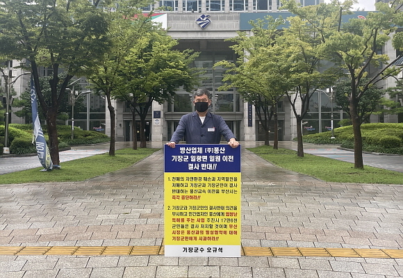 먼저 오규석 군수는 이날 1인 시위에서 “방산업체 풍산이 이전하려 하는 기장군 일광면 일대는 전체의 97%가 보전녹지지역으로 공장이 결코 들어올 수 없는 곳”이라며 “또 10만 5000여명이 거주하는 일광신도시와 정관신도시가 인근에 있다. 기장군민의 생명권과 재산권을 무시한 채 추진되는 방산업체 풍산의 기장군 이전 계획은 즉각 중단돼야 한다”고 주장했다.