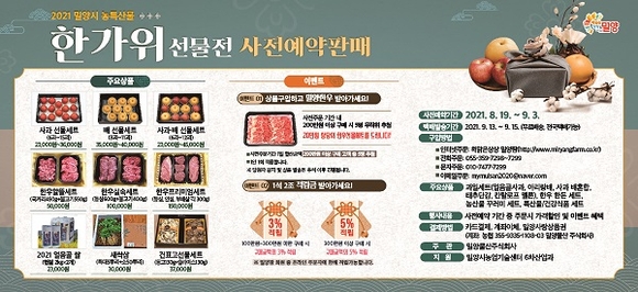경남 밀양시는 오는 9월 추석을 맞아 햇살 좋은 밀양에서 생산되는 농산물과 특산물 꾸러미 총 35종을 사전 예약 판매한다고 24일 밝혔다.