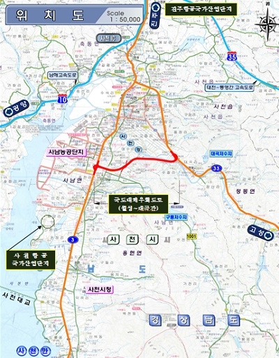 사천시 사남~정동 국도대체우회도로는 사남면 월성리와 정동면 대곡리를 연결하는 왕복 4차로 건설사업으로 1일 교통량이 5만대에 이르는 국도3호선의 도로 서비스 개선을 위한 사업이다.