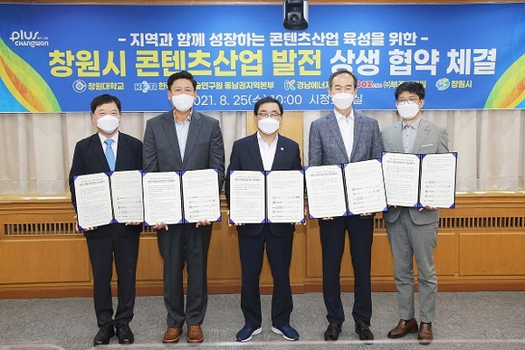 경남 창원시는 25일 오전 시정회의실에서 창원대학교, 한국전자기술연구원 동남권지역본부, 경남에너지㈜, ㈜부즈씨앤씨와 '창원시 콘텐츠산업 발전 상생 협약'을 체결했다.