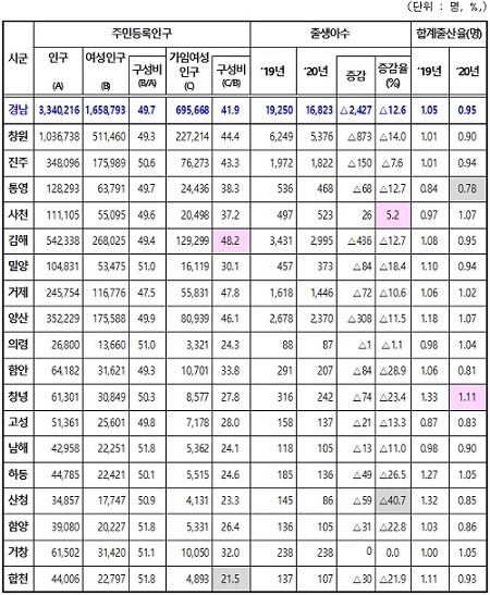 지난해 경남의 합계출산율(여성 1명이 평생 낳을 것으로 예상되는 자녀수)이 0.95명을 기록하면서 0명대로 처음 진입했다. 경남도는 다양한 정책으로 인구변화에 선제적으로 대응할 계획이라고 밝혔다.